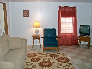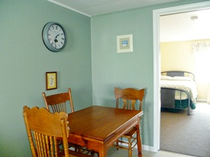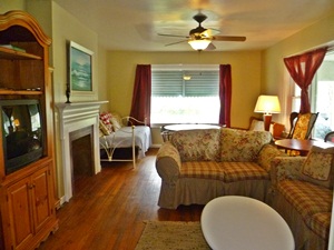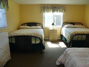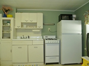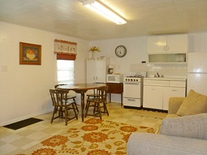 Updated one bedroom cottage has 2 full sized beds and sleeps up to 4 people. There is a pull-out queen sleeper in the living room. The cottage has one full bathroom with a tub/shower and a kitchen with a full size fridge, small size gas oven/range, microwave, dishes and utensils.